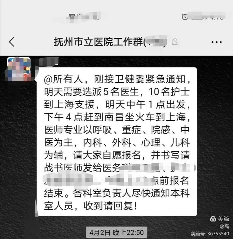 4月2日晚11时左右,接到医院次日要派医护人员前去上海支援抗疫的通知,全院医护人员都积极报名,在院领导的指挥下迅速集结一支实力过硬的优秀团队,奔沪抗疫。4月3日我们团队带着院领导的嘱托与全院同仁的信任,携带充足防疫物资,在抚州市新体育馆集合前往上海。