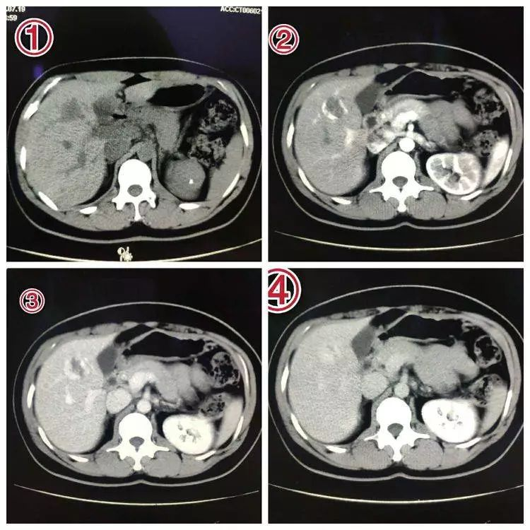 拿到的CT图像如下图,图1为CT平扫,可见肝实质上有个类圆形的低密度影,但其性质待定;图2为增强的动脉期,可见病灶边缘成高密度结节状强化;图3为增强的静脉期,可见增强区域呈稍高密度逐渐向病灶中心扩展;图4为增强的延迟期,可见造影剂完全充填病灶,呈等密度。